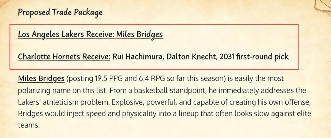 美媒《Fadeaway World》撰文建议,湖人应该考虑将八村垒、克内克特以及2031年的首轮签送到黄蜂,换回前锋布里奇斯。